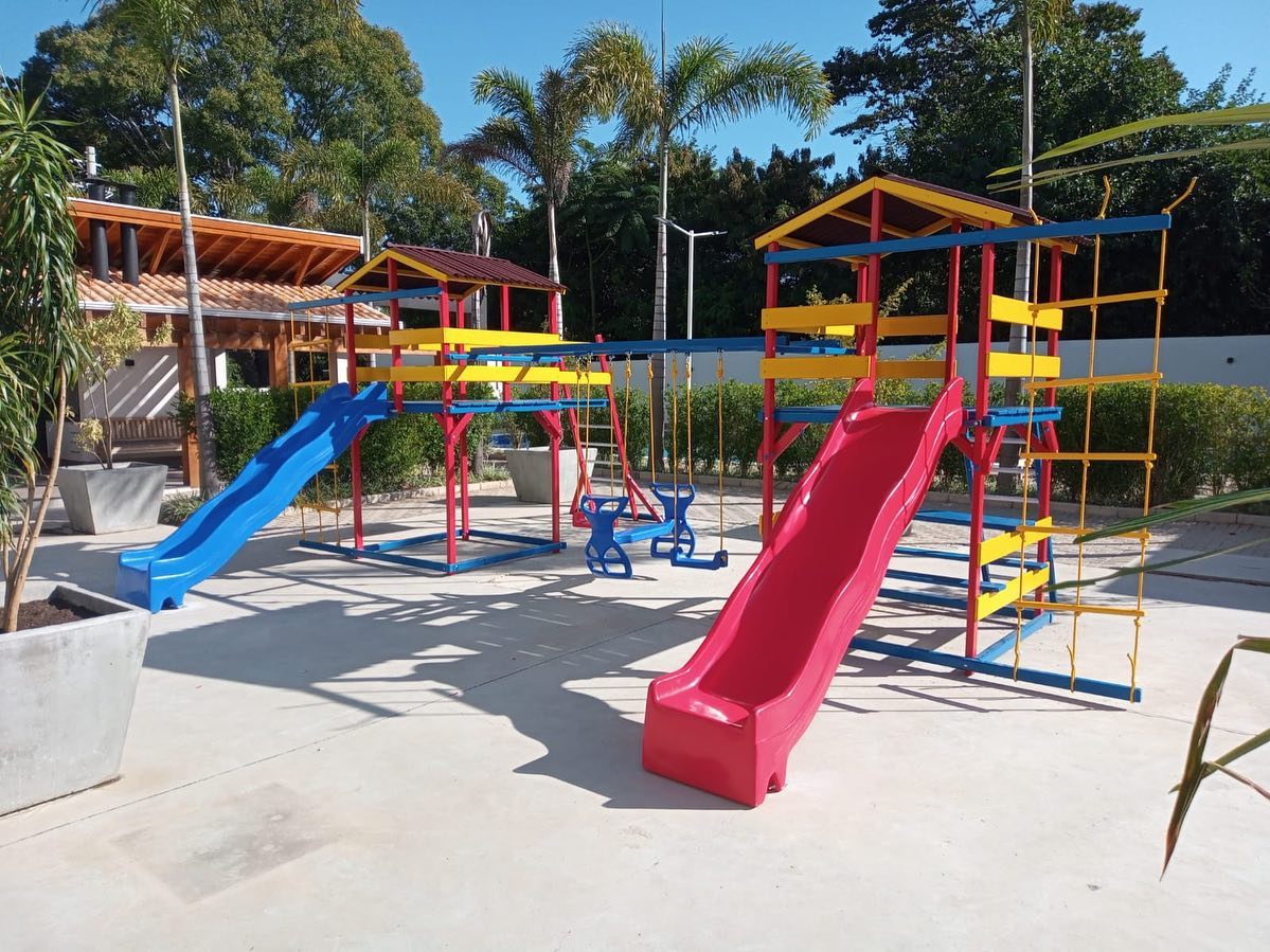 Para momentos de diversão mais tradicionais, o conjunto também inclui dois balanços, onde as crianças podem balançar para cima e para baixo, aproveitando a sensação de liberdade no ar. Além disso, há um vai e vem de plástico, onde as crianças podem se divertir empurrando e puxando, colaborando em movimento de ida e volta.